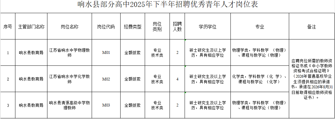 具體崗位及招聘條件等詳見《響水縣部分高中2025年下半年招聘優(yōu)秀青年人才崗位表》(以下簡稱《崗位表》)(附件1)。