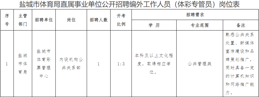 鹽城市體育局直屬事業(yè)單位公開招聘編外工作人員(體彩專管員)1名