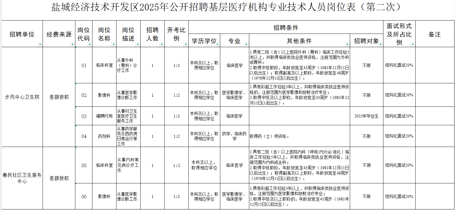 招聘崗位及招聘條件等詳見《鹽城經(jīng)濟(jì)技術(shù)開發(fā)區(qū)2025年公開招聘基層醫(yī)療機(jī)構(gòu)專業(yè)技術(shù)人員崗位表(第二次)》 (附件1,以下簡(jiǎn)稱《崗位表》)。