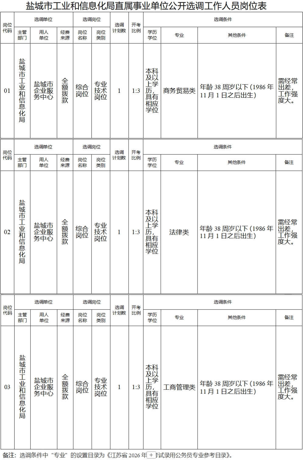 本次選調(diào)崗位3個(gè),各1人。具體選調(diào)崗位信息見(jiàn)《鹽城市工業(yè)和信息化局直屬事業(yè)單位公開(kāi)選調(diào)工作人員崗位表》(附件1)。