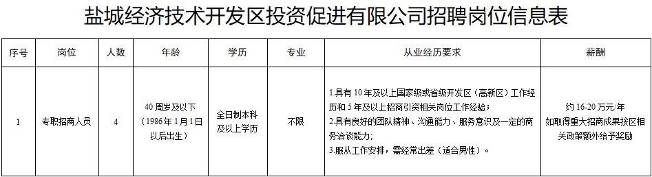 鹽城經(jīng)濟(jì)技術(shù)開發(fā)區(qū)投資促進(jìn)有限公司公開招聘專職招商人員4名