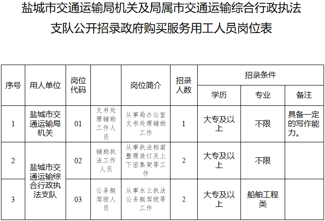 招錄崗位及條件詳見《鹽城市交通運(yùn)輸局機(jī)關(guān)及局屬市交通運(yùn)輸綜合行政執(zhí)法支隊(duì)公開招錄政府購買服務(wù)用工人員崗位表》(附件)。
