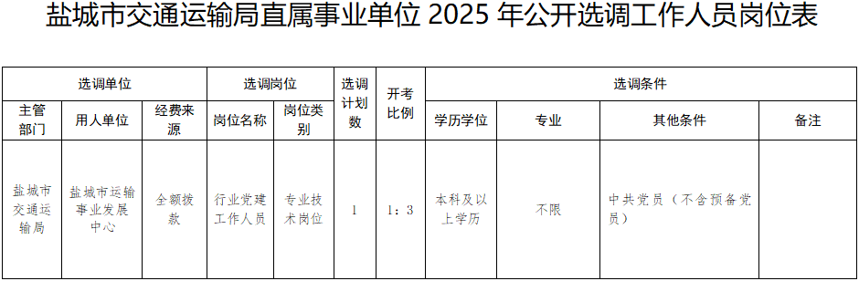 本次選調(diào)工作人員1名,選調(diào)崗位詳見《鹽城市交通運輸局直屬事業(yè)單位2025年公開選調(diào)工作人員崗位表》(附件1)。